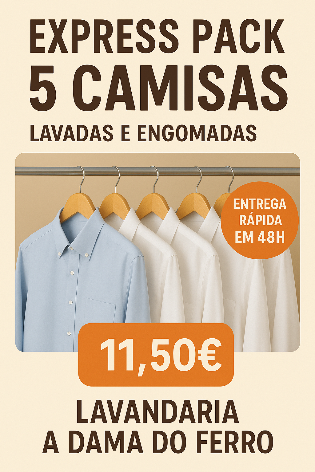 A camisa é uma peça fundamental no vestuário quotidiano e ter sempre camisas limpas e bem passadas é uma prioridade para muitos. O nosso Express Pack foi desenvolvido especialmente para atender a essa necessidade urgente, permitindo que você lave e engome 5 camisas em num prazo recorde de 48 horas.